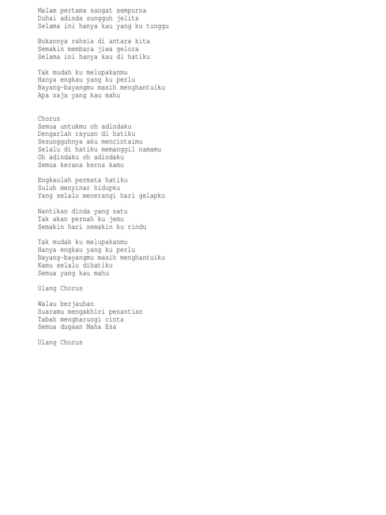 Mu sayangku hanya kau yang satu kasih dan rinduku milik mu engkaulah yang satu pujaan hatiku sucinya cintaku pada mu sayangku hanya kau yang satu kasih dan rindu ku milik mu.